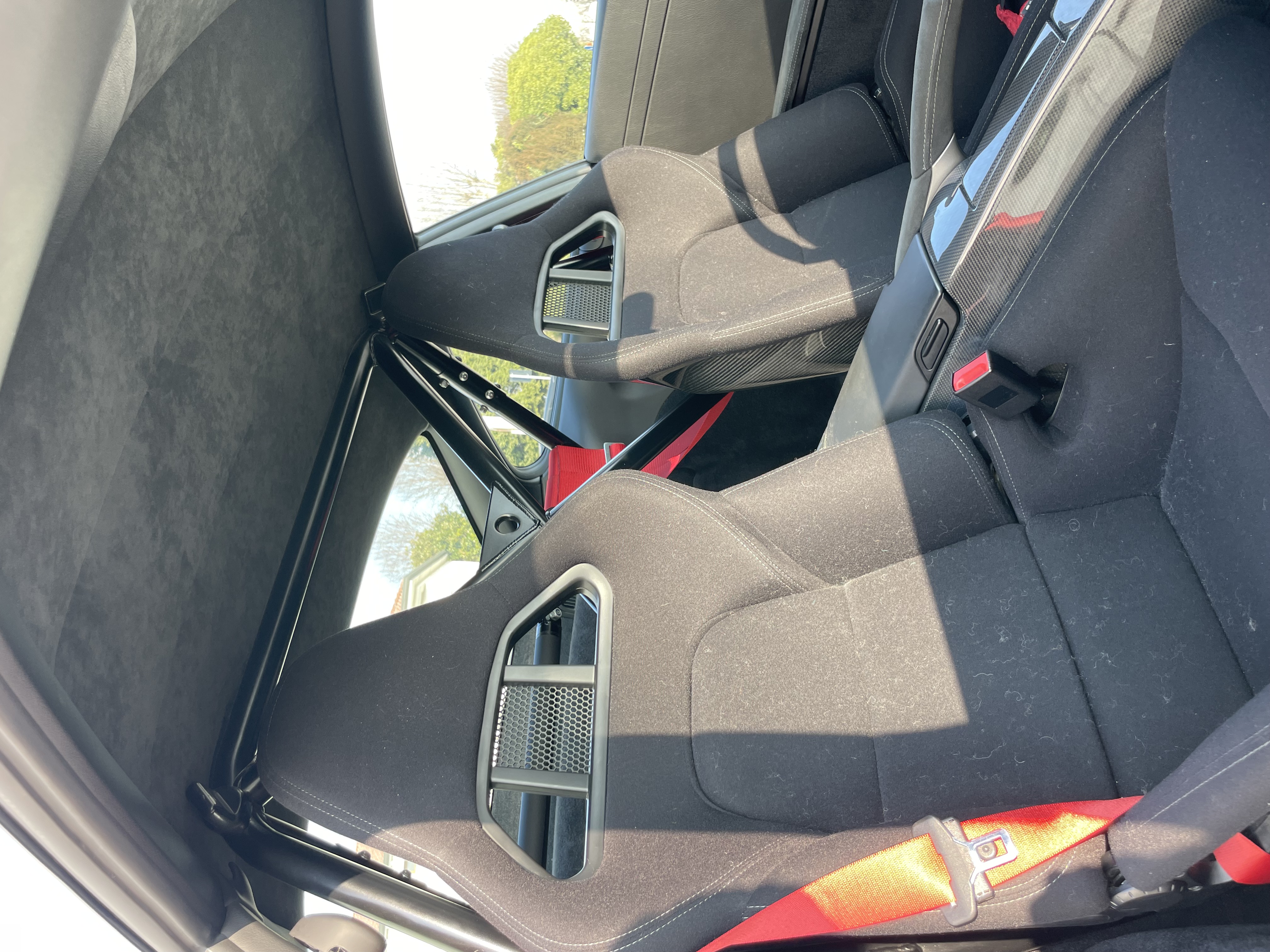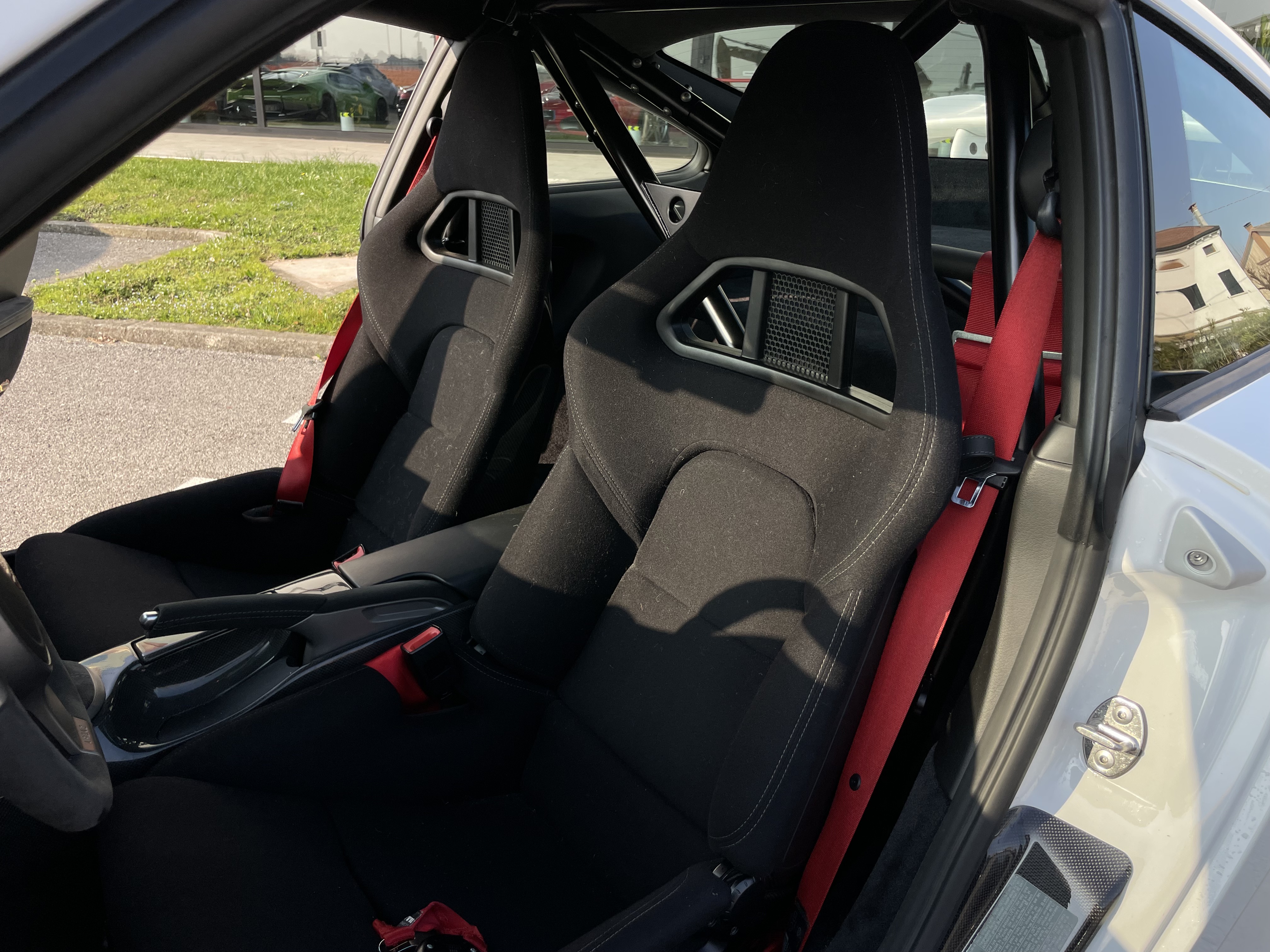 - Sedili a guscio da corsa e cinture di sicurezza rosse a contrasto.